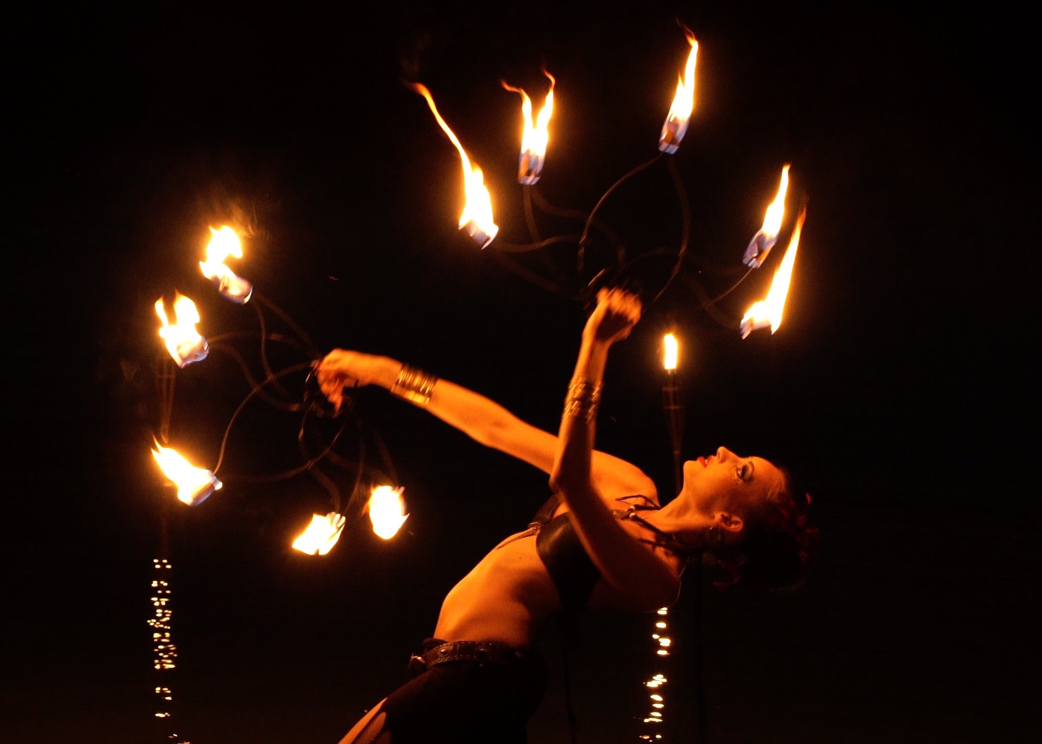 Die große Feuershow beinhaltet den Tanz mit verschieden Feuerrequisiten wie Feuerfächer, Feuerpoi, Körperfeuer, Handfackeln, Feuerstab, Feuerschirm, Springseil usw.
