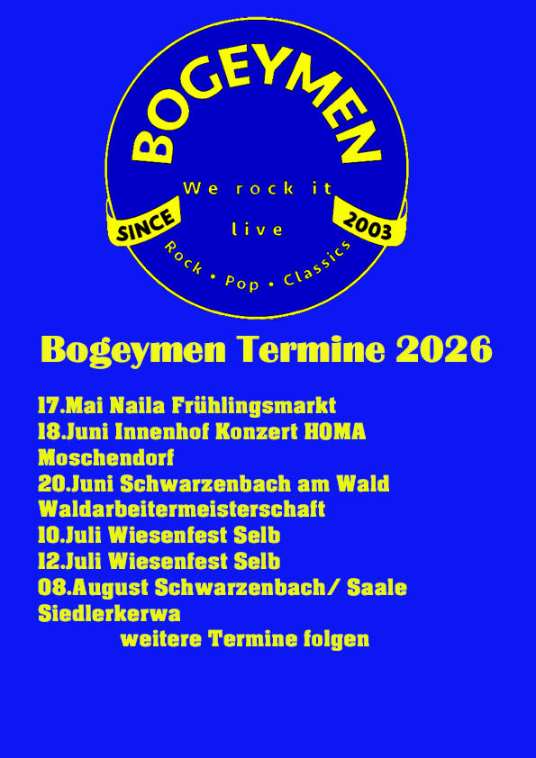 Was machen wir? Bogeymen, eine herausragende Live-Band, präsentiert ein Repertoire, das die Vielfalt der Musikgeschichte einfängt und in mitreißenden Live-Performances zum Leben erweckt. Von Rock'n'Roll-Klassikern bis hin zu zeitlosen Pop-Hits bietet Bogeymen eine breite Palette von Songs für jeden Anlass und Geschmack.