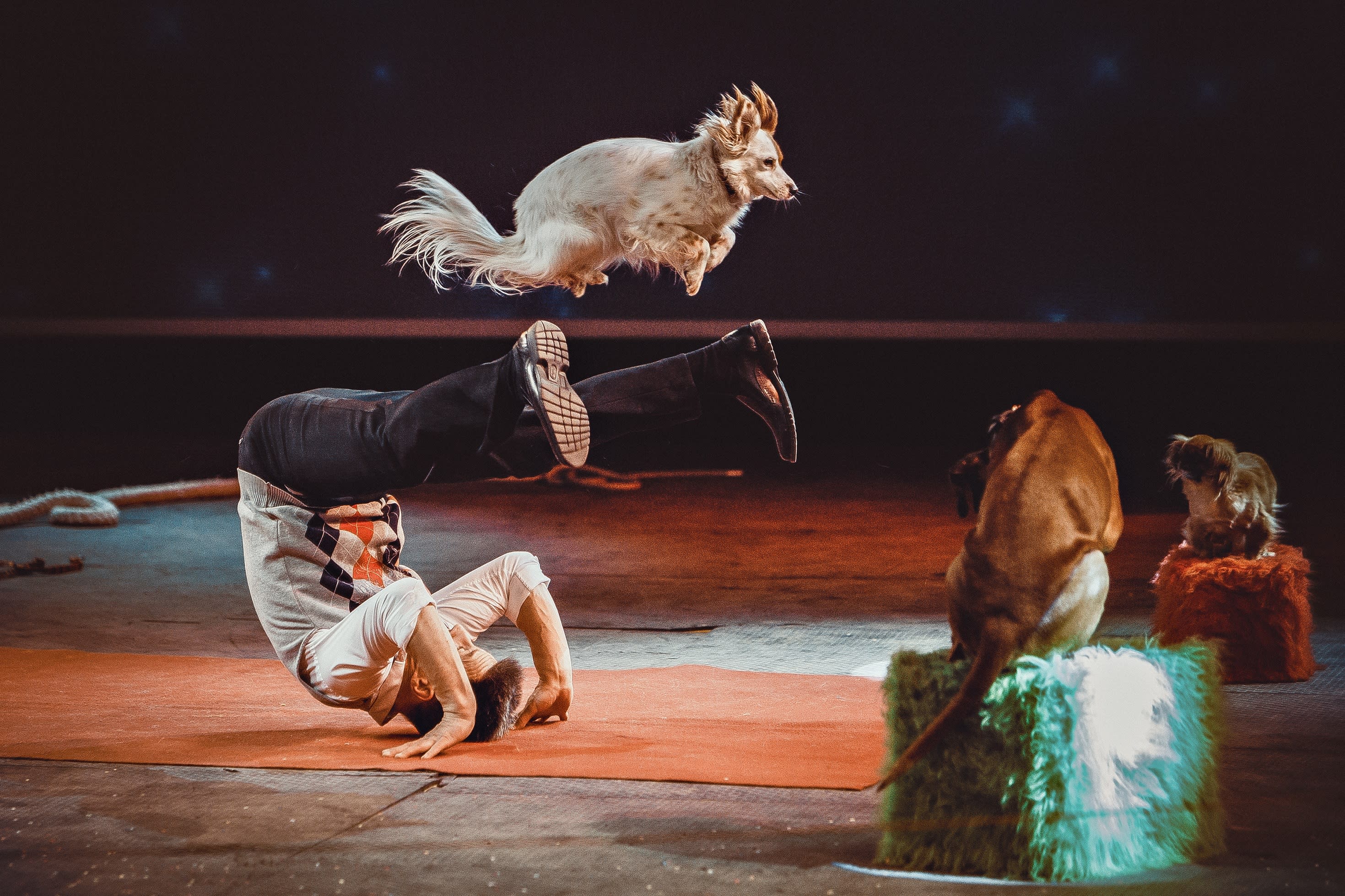 Die Hunde tanzen Rock `n` Roll, machen Spagat und drehen Pirouetten.