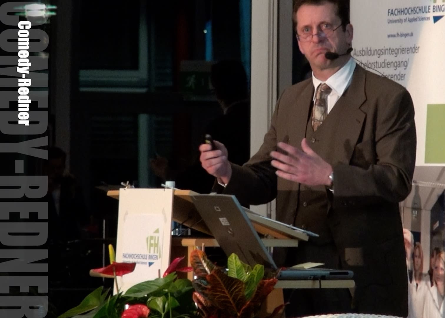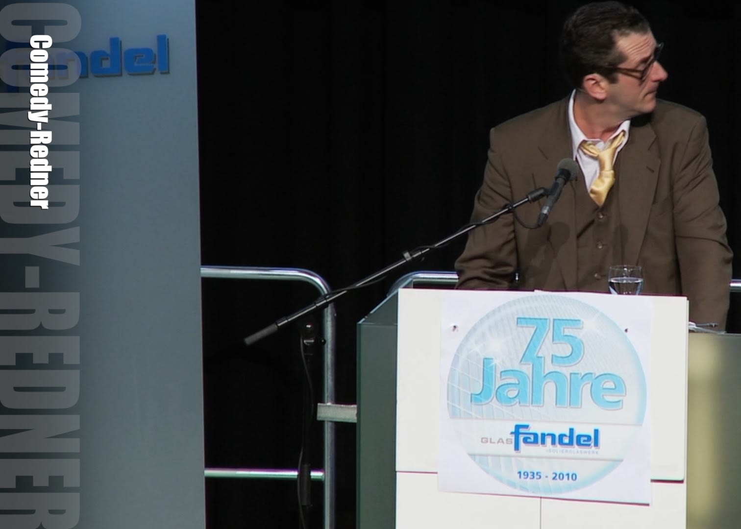 Der Comedy-Redner als „angebliche“ Koryphäe: Der falsche Redner Prof. Hansen soll ein äußerst kompetenter Fachmann sein, so ist er zumindest angekündigt … wie langweilig! Er kämpft sich durch seinen Text, den er zum Teil sogar ablesen muss. Seine offensichtliche Kurzsichtigkeit ist da auch keine Hilfe. Aber zum Glück hat er ja eine große Lupe dabei.