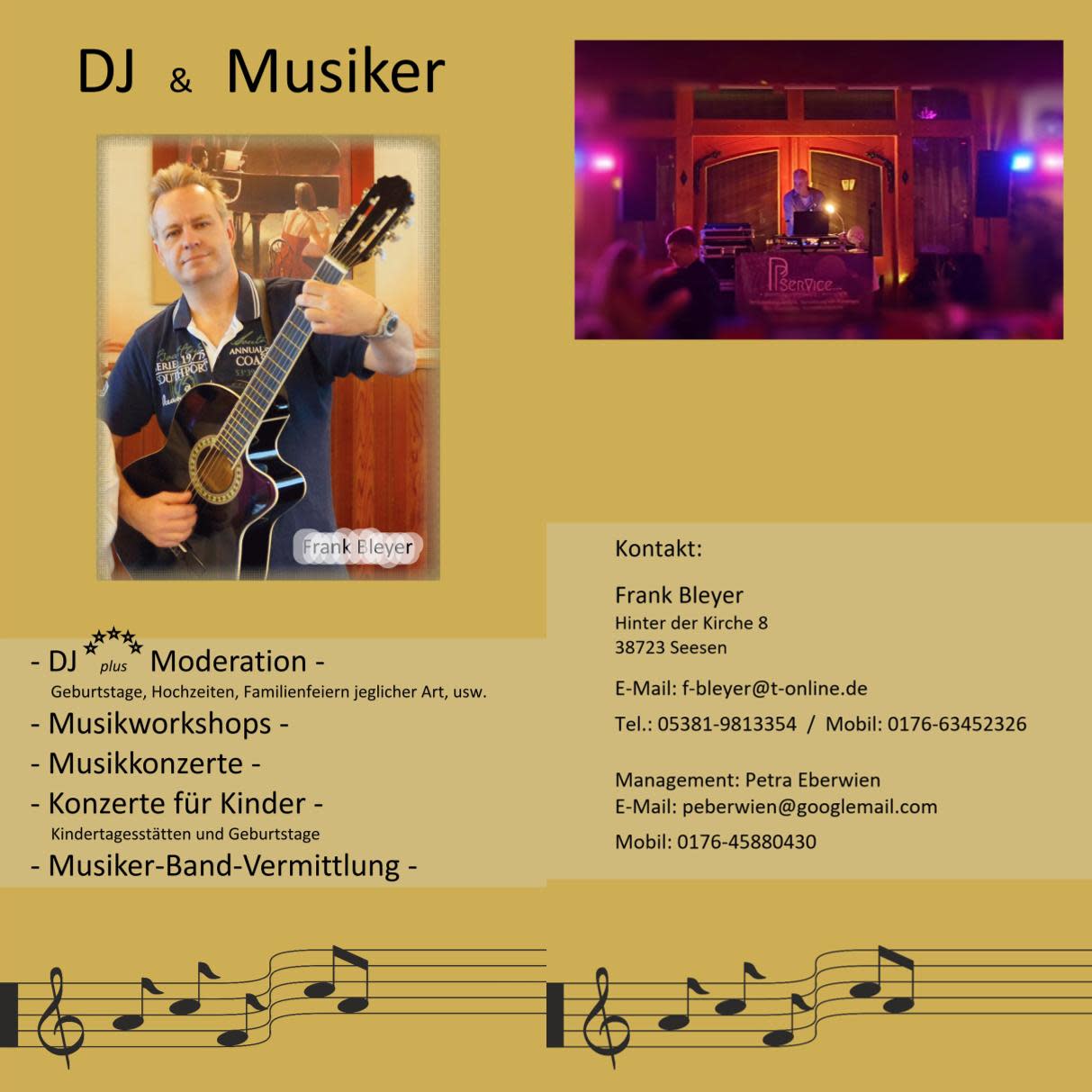 Bin Musiker seit über 40 Jahren, bin als Live Musiker unterwegs und auch als DJ! Bin sehr kontaktfreudig und kann mich individuell auf das jeweilige Publikum einstellen! Verfüge über eine riesige Musiksammlung! Kombination DJ und live Musik Einlage(Gitarre und Gesang) möglich bei Interesse!