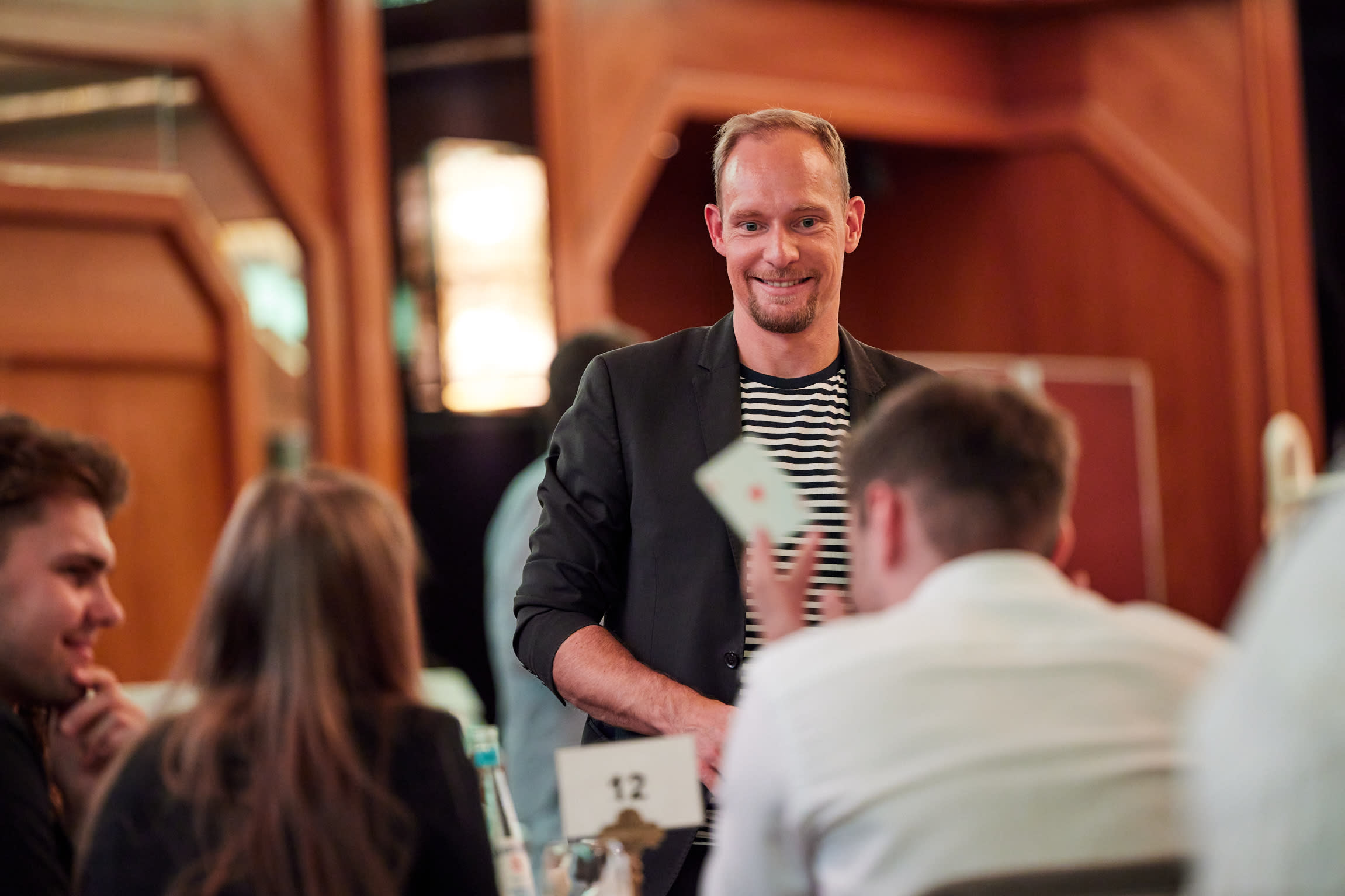 Bei der Close Up Zauberei gehe ich von Tisch zu Tisch und mische mich unter die Leute. Die Effekte sind modern und humorvoll und versetzen die Gäste in garantiert gute Stimmung, denn so hautnah haben die meisten Zauberei wahrscheinlich noch nicht erlebt. Die Dauer hängt von der Personenanzahl ab und ist flexible von 1 Stunde bis abendfüllend.