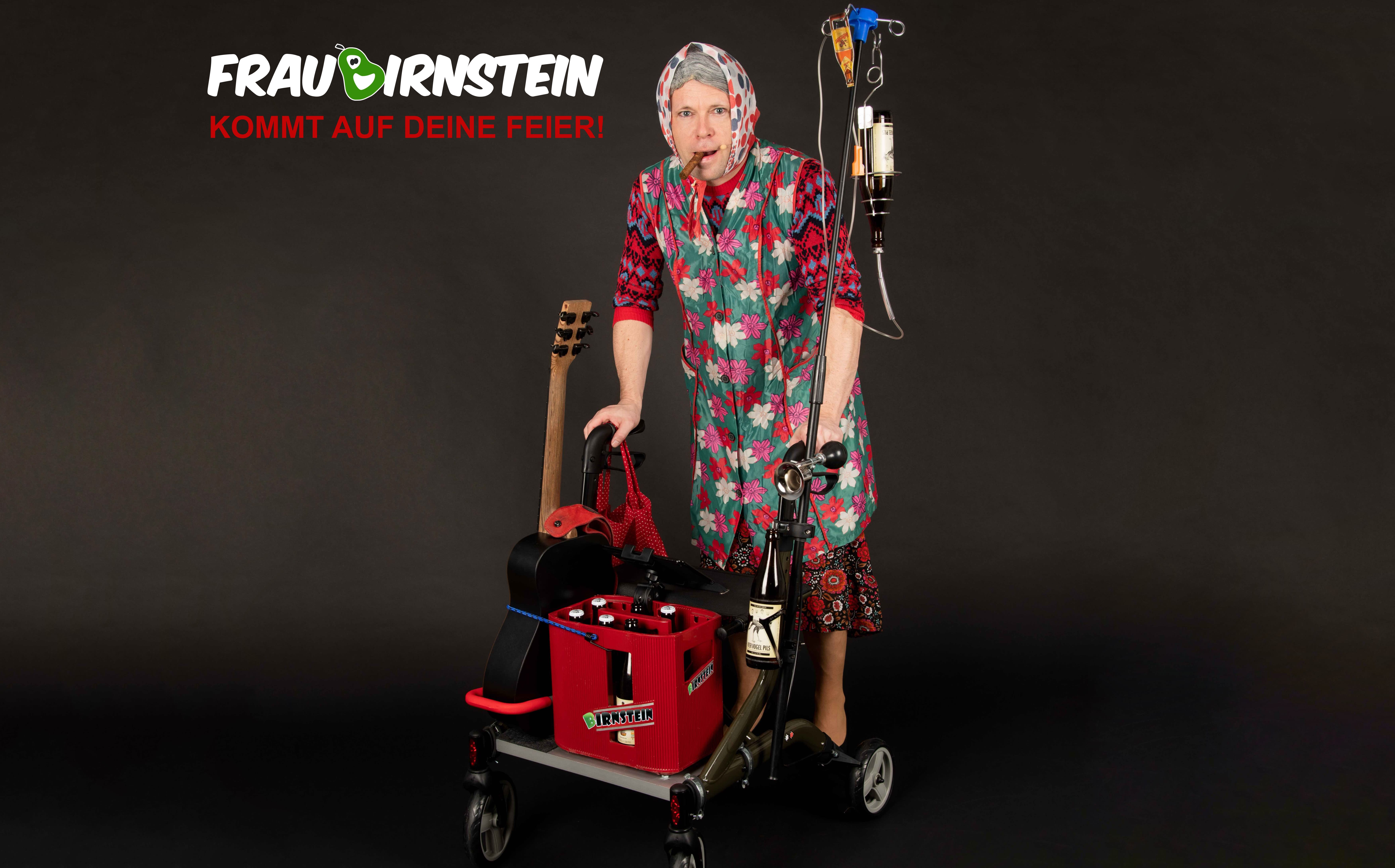 Frau Birnstein rollt mit ihrem umgebauten Rollator und jeder Menge "Treibstoff" auf eure Party! Die alte Dame mischt jede Feier mit ihrem innovatives Stand up - Programm auf. Dabei bezieht die Rollator-Oma ihre Gäste in ihre Show mit ein und vertreibt so jegliche Langeweile.