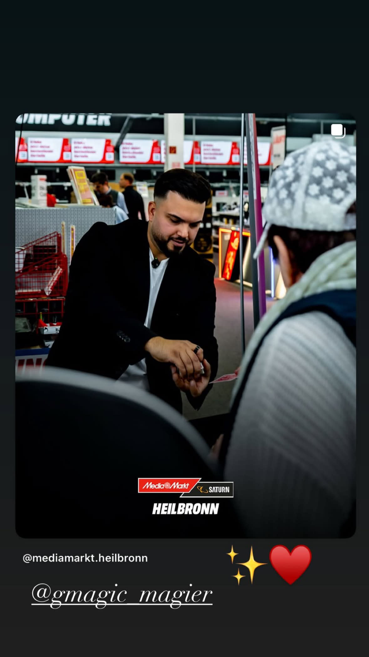 mein Name ist György Stadtmüller und bin Zauberer. Ich übe den Close Up Magie Kunst schon seit über 15 Jahren. Siehe im Media Markt Heilbronn wo ich schon Jahr für Jahr hingehe und die Leute zum Staunen bringe. Ich liebe es was ich mache. Ich hatte schon auch mehrere Bühne/Stand Up Shows also das ist für mich egal ob 5 oder 100 Leute mich gleichzeitig sehen. Ich bringe immer die Magie auf dem höchsten Niveu.