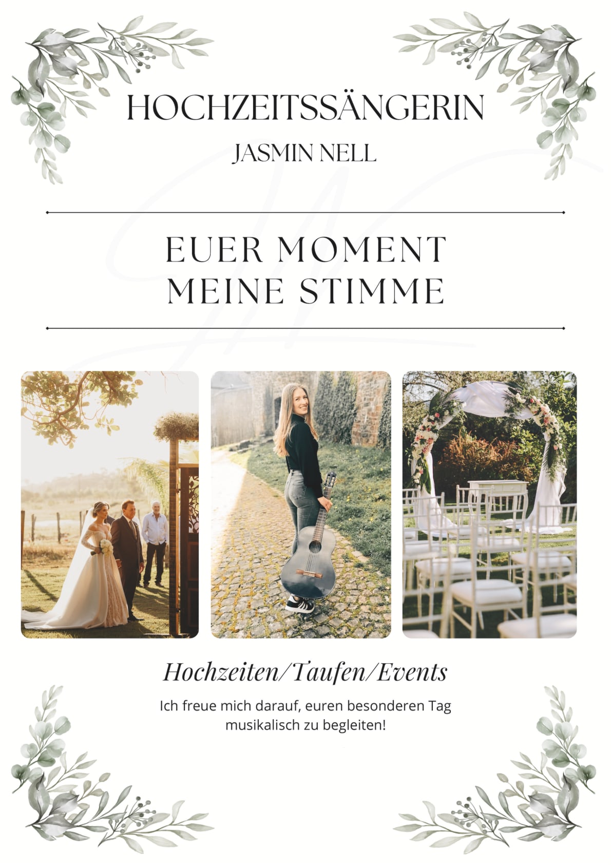 Wenn Sie Eventsängerin Jasmin Nell über dieses Formular kontaktieren, antwortet Eventsängerin Jasmin Nell Ihnen schnellstmöglich. Es ist gratis. Sie verpflichten sich nicht dazu, das erhaltene Angebot anzunehmen.