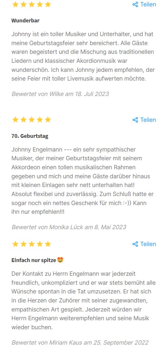 Johnny Engelmann hat unseren Abend sehr bereichert. Er hat gute Musik gemacht, die auch gute Stimmung brachte. Er war freundlich, höflich und hilfsbereit. Ich würde ihn jederzeit wieder buchen.