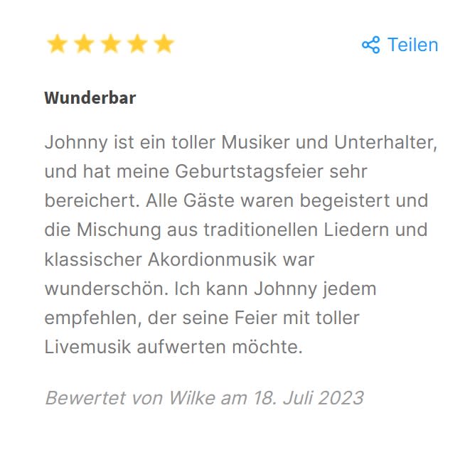 Johnny ist ein toller Musiker und Unterhalter, und hat meine Geburtstagsfeier sehr bereichert. Alle Gäste waren begeistert und die Mischung aus traditionellen Liedern und klassischer Akordionmusik war wunderschön. Ich kann Johnny jedem empfehlen, der seine Feier mit toller Livemusik aufwerten möchte.