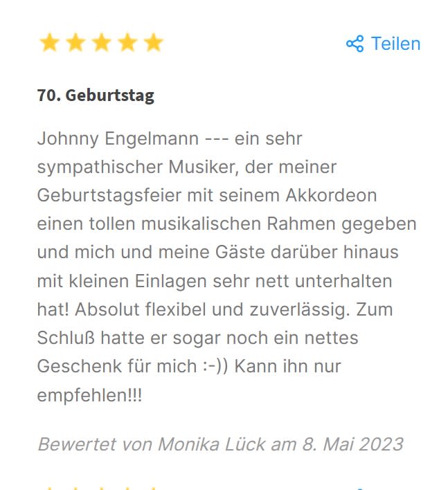 Top-Empfehlung! Johnny Engelmann hat unseren runden Geburtstag musikalisch perfekt untermalt und für eine fantastische Stimmung gesorgt. Er ist nicht nur ein Profi am Akkordeon, sondern auch ein sehr sympathischer, freundlicher und angenehm zurückhaltender Mensch. Vielen Dank für diesen tollen Beitrag zu unserem Fest!