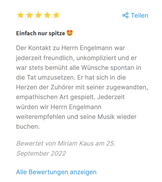 Der Kontakt zu Herrn Engelmann war jederzeit freundlich, unkompliziert und er war stets bemüht alle Wünsche spontan in die Tat umzusetzen. Er hat sich in die Herzen der Zuhörer mit seiner zugewandten, empathischen Art gespielt. Jederzeit würden wir Herrn Engelmann weiterempfehlen und seine Musik wieder buchen.