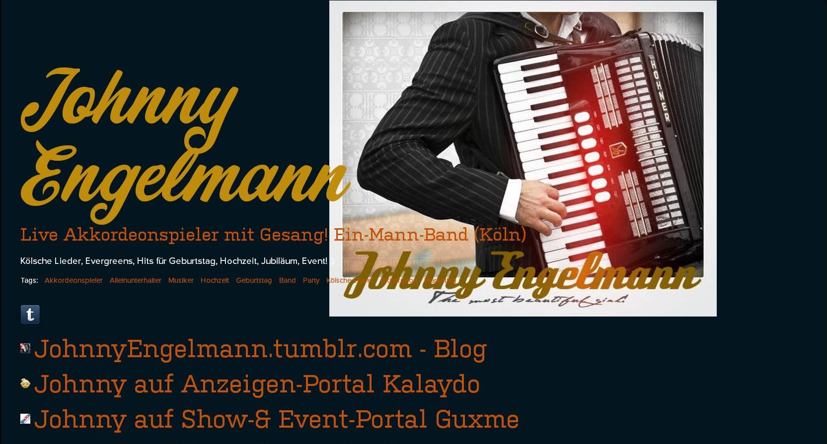 TIPP! Junger charmanter Kölner Akkordeonspieler mit 1a Referenzen (Promis)! Top Live-Entertainer, der sich in die Herzen der Menschen gespielt hat : ) Johnny Engelmann spielt & singt "met Hätz un Jeföhl" / mit Herz, Seele & Gefühl Rheinische & Kölsche Lieder, Hits, Evergreens, nostalgische Deutsche Schlager & Mitsinglieder, Französische Chansons & Musette mit Paris-Flair, Wiesn, Shantys / Seemannslieder, Folk, Swing, Latin, Tanzmusik, Hits der 1920er bis 1990er-Jahre: über 1.000 Lieder Live-Repertoire!