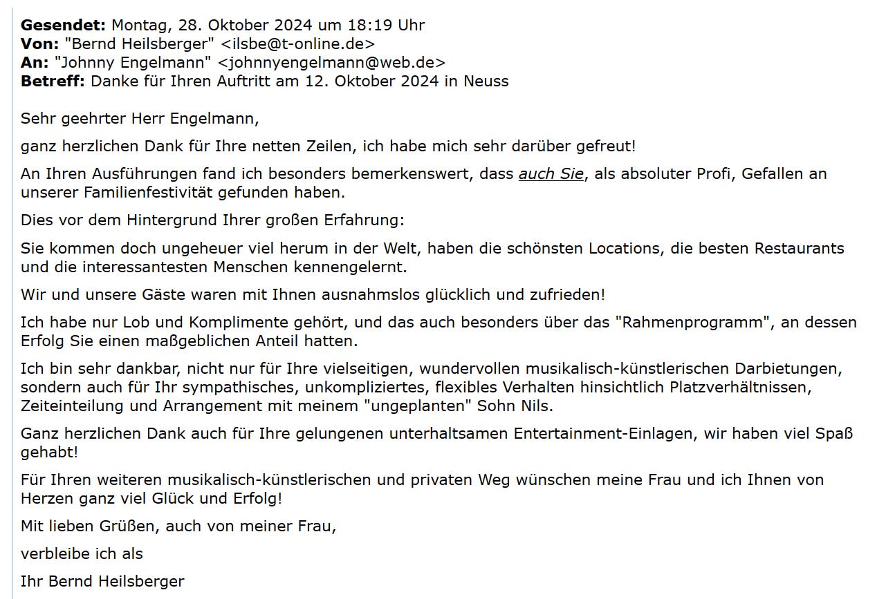 "Lieber Herr Engelmann, viele Gäste haben mir gesagt, wie schön Ihre Gesangseinlage auf der Hochzeitsfeier in Köln gewesen sei und haben mich gefragt, wie ich Sie denn gefunden hätte…. – das Internet ist ja doch eine tolle Sache!!! Und das Brautpaar war ganz gerührt!!! Hinzu kommt, daß Sie sehr sympathisch sind und sich in die Situation des Brautpaares sehr gut und empathisch einfühlen konnten! Wir wünschen Ihnen auch weiterhin ganz viele schöne Auftritte bei netten Menschen!"
