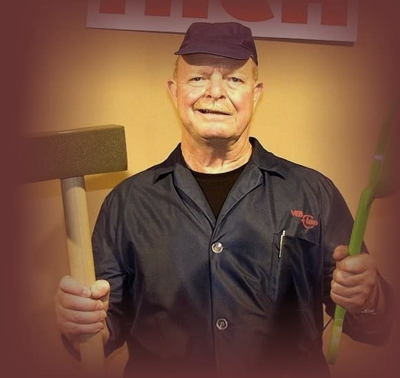 Seine Markenzeichen sind der blaue Dederon-Kittel und der gepflegte sächsische Dialekt.