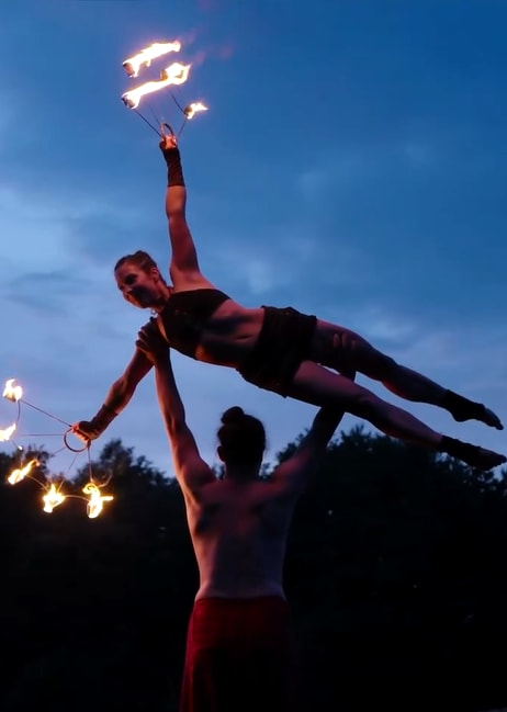 Wir zeigen eine professionell inszenierte Duofeuershow, die Feuerartistik, Lichtkunst und Partnerakrobatik zu einer geschlossenen Bühnenperformance verbindet. Die Show vereint akrobatische Elemente, fließende Feuerchoreografien und körpernahe Interaktion.