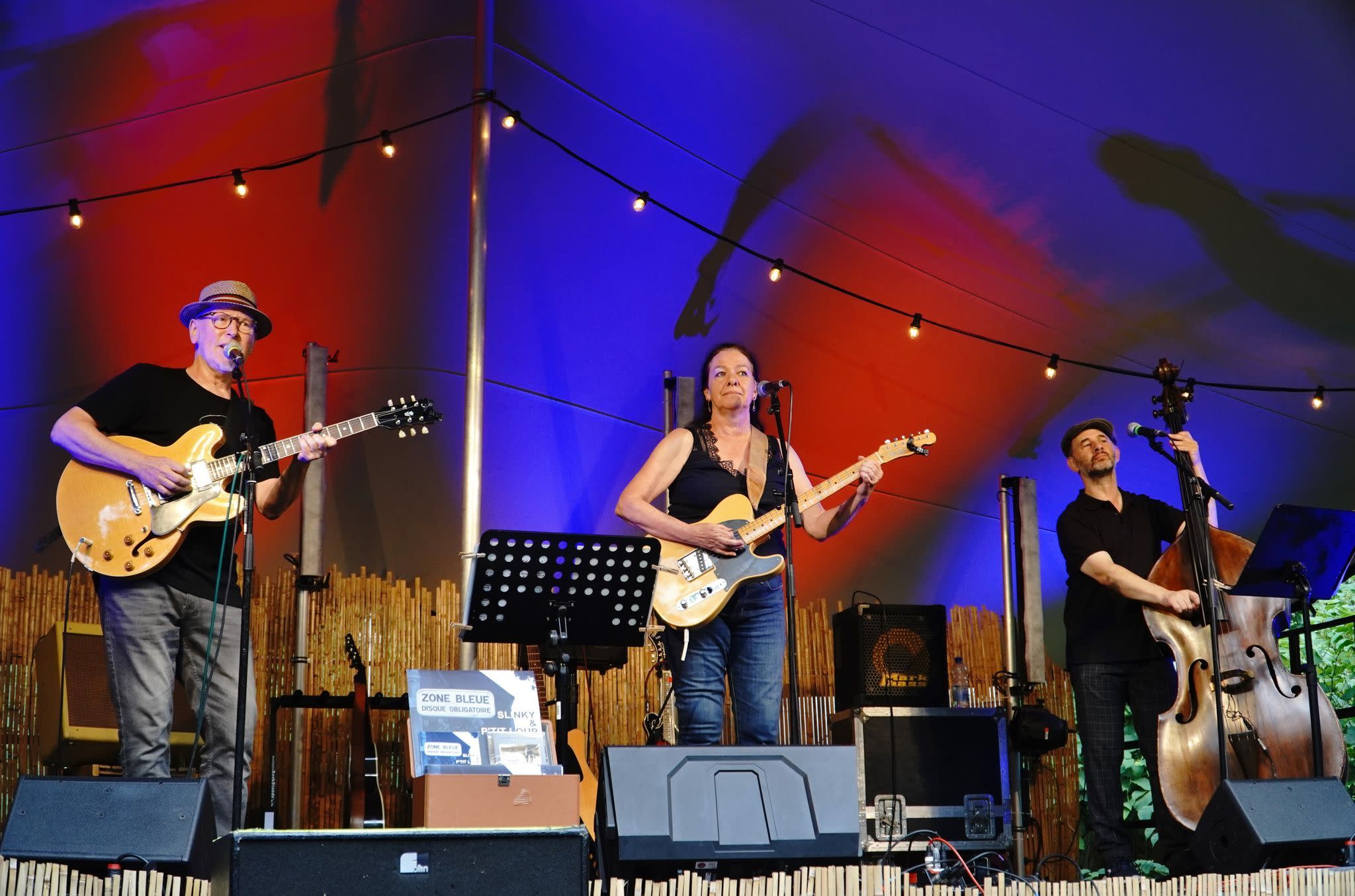 Zone Bleue (auch auf Vinyl erhältlich) bietet die gleiche Vielfalt an musikalischen Stilen, die dem Paar lobende Kritiken und weltweites Radio Airplay einbrachten, allerdings in einem etwas anderen Format. Kurz nach der Veröffentlichung von Movin On‘ begannen Slinky und P’tit Loup mit dem Kontrabassisten Joe Leduc (Jochen Solbach) zu touren. Schnell entdeckten sie, dass sein geschmackvolles Spiel und seine Backing Vocals Tiefe zu ihrem Mix hinzufügten und das Publikum begeisterte, wo immer sie auftraten. Als mittlerweile festes Ensemblemitglied rundet Monster Joe’s Mitwirkung den Sound der Band ab.