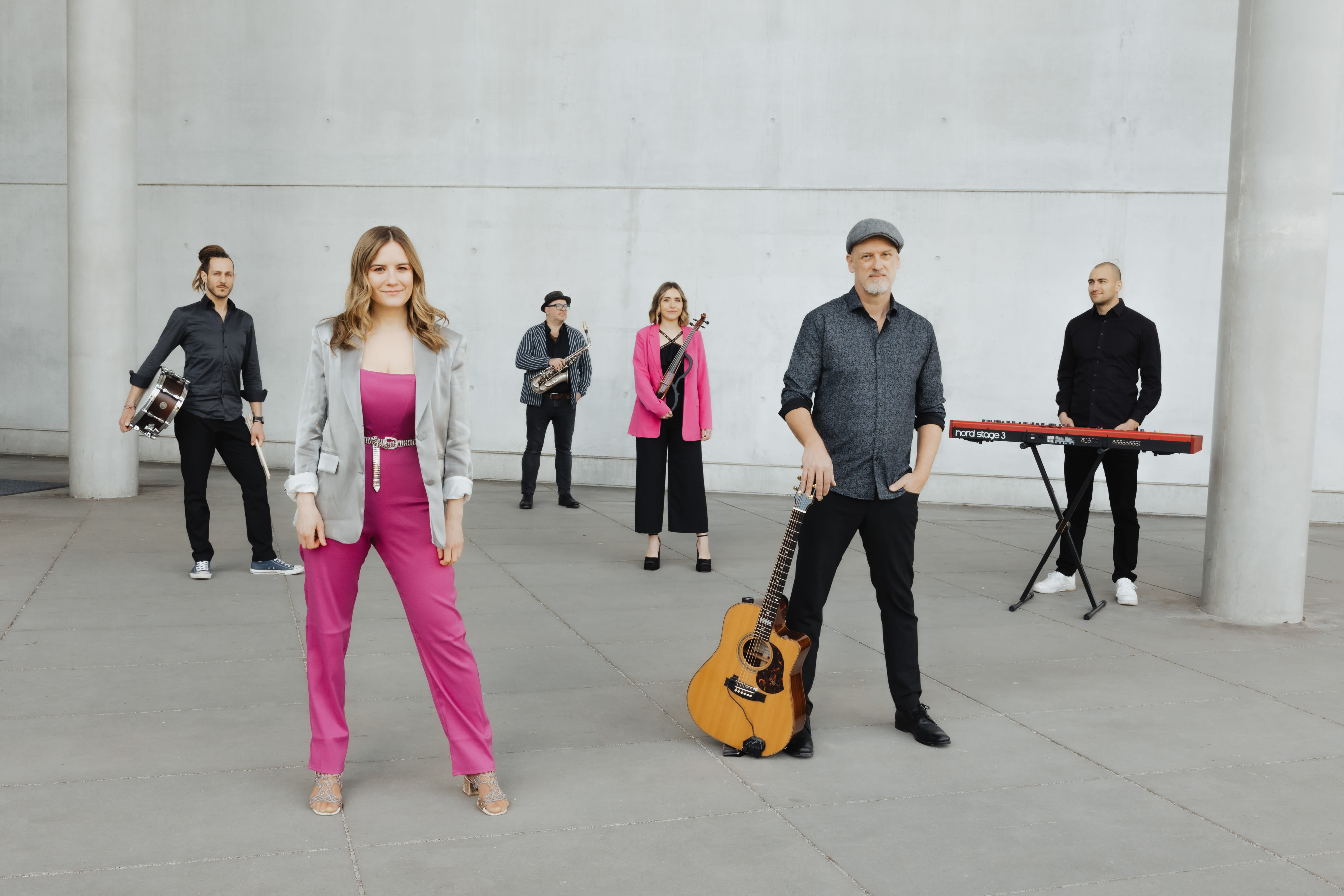 Sie ist für Hochzeiten und Events in Live Band Kombis von Solo - Quintett und in Dj Live Kombis mit Gesang , Geige und/oder Saxophon buchbar.