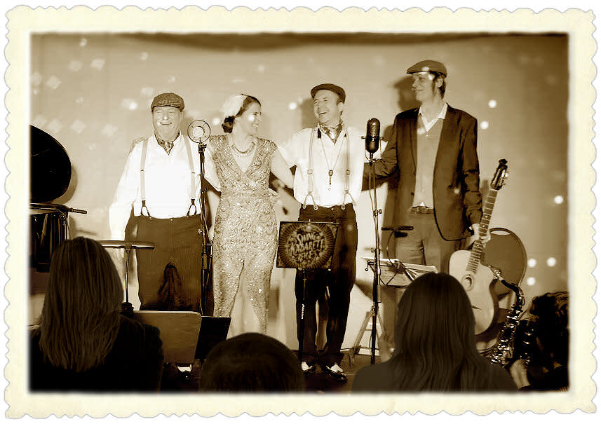 Wir lassen die goldenen Zwanziger wieder aufleben! Frisch, fröhlich und beschwingt unterhalten und entführen wir Sie in dieses faszinierende Zeitalter vergangener Tage - nostalgisch, bisweilen frivol, frech und anzüglich, aber stets niveauvoll, authentisch und nie altbacken. Hören Sie Gassenhauer und Alltagsschlager unvergessener Stars wie den Comedian Harmonists, Marlene Dietrich oder Zarah Leander, tanzen Sie zu heißem Charleston und Swing, lauschen Sie humorvollen Kabarettstückchen in charmanter Präsentation. Populäre Unterhaltungsmusik, Filmschlager und Tanzmusik in vorwiegend deutscher Sprache werden aus jener Zeit stilvoll interpretiert, wie z.B. auch von Max Raabe & seinem Palastorchester. Nostalgisch, romantisch, frech, frivol, beschwingt, fröhlich und gekonnt unterhalten wir das Publikum auf eine ganz unverwechselbare Art und Weise und entführen es charmant in die "Roaring Twenties".