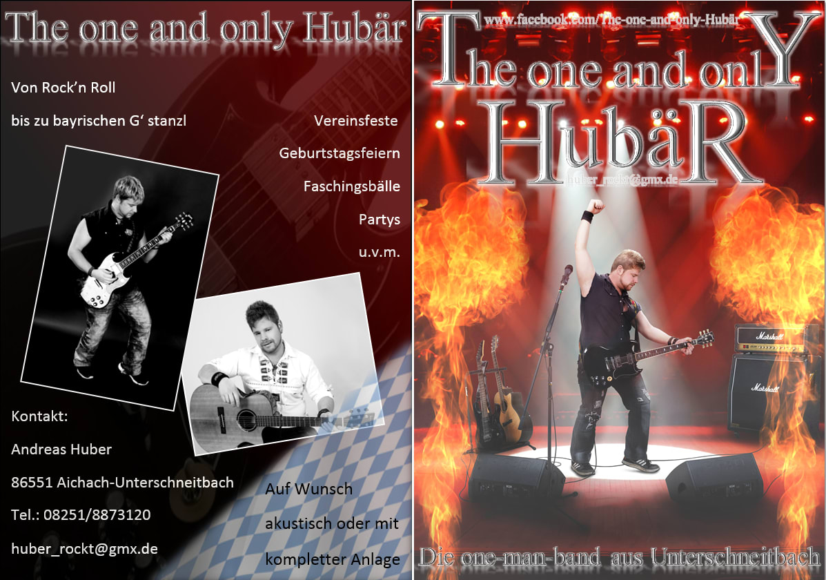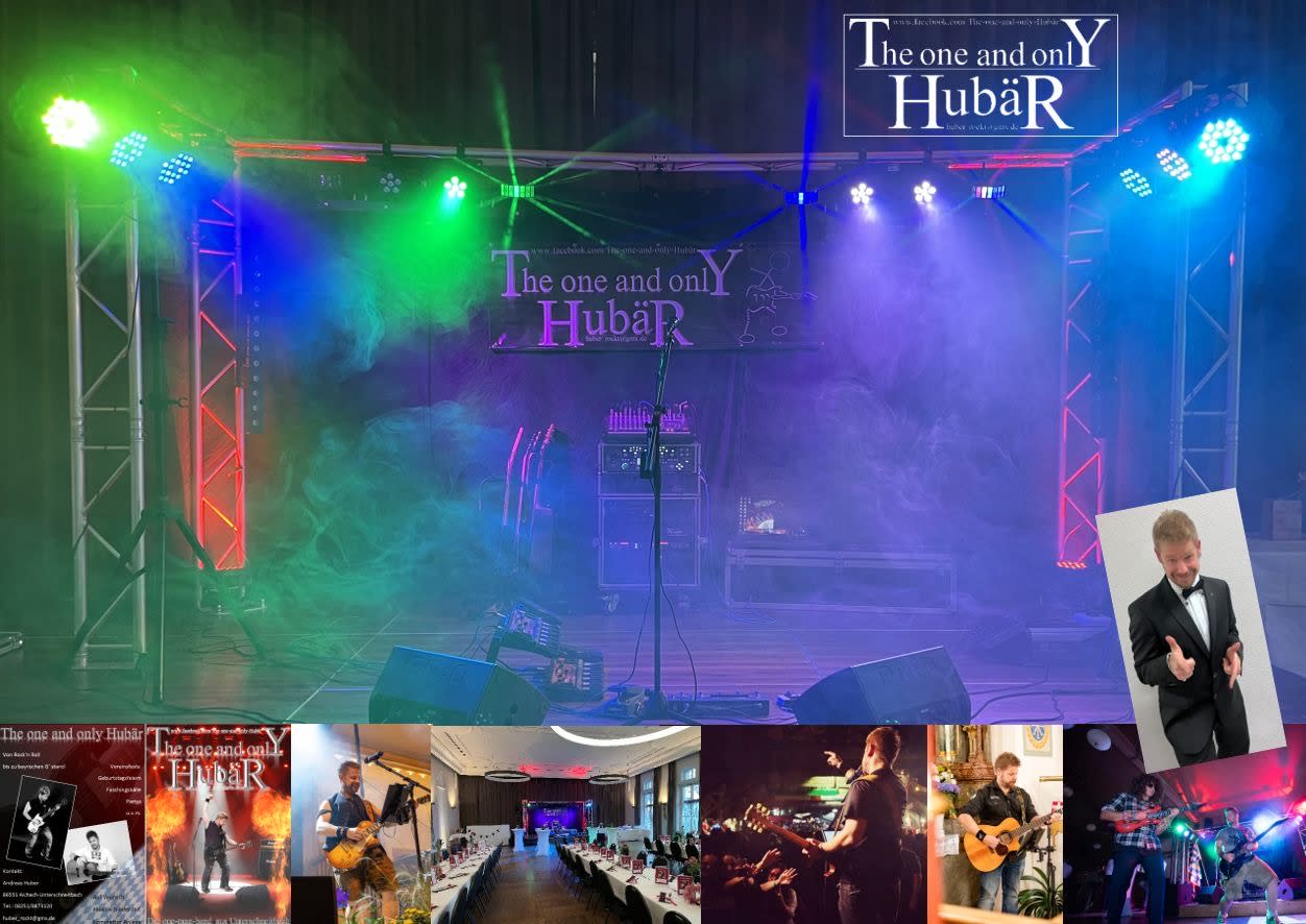 Andreas Huber (The one and only Hubär) ist ein echter Allrounder mit langjähriger Bühnen- und Banderfahrung. Egal ob Hochzeit, Geburtstag oder Vereinsfest, durch sein vielseitiges Repertoire bleibt kein Wunsch offen. Egal ob Bayrische G'stanzl (rein akustisch) oder mit vollem Bühnenaufbau wird mit verschiedenen Musikstilen von Tanzmusik über Party bis hin zum Rock alles abgedeckt damit Ihr Fest ein Erfolg wird.