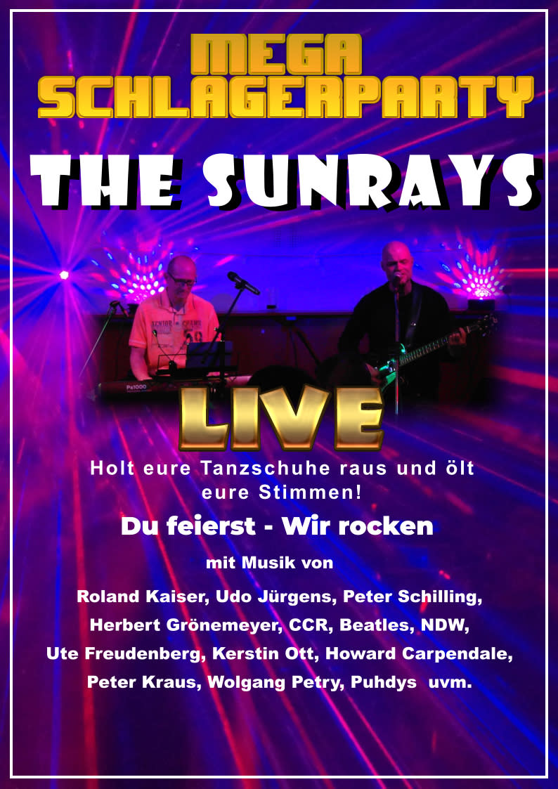 THE SUNRAYS – ist die Partyband, die Ihr Event zu einem Knaller macht! Die zwei Bandmitglieder vielseitig – mit Discoklassikern, Schlagern , Oldies und aktuellen Chartbreakern bringen wir Ihr Publikum zum Toben. Dabei legt THE SUNRAYS großen Wert auf einen musikalischen Spannungsbogen über den ganzen Abend, der eigentlich immer auf die gleiche Weise endet: „Zugabe!“