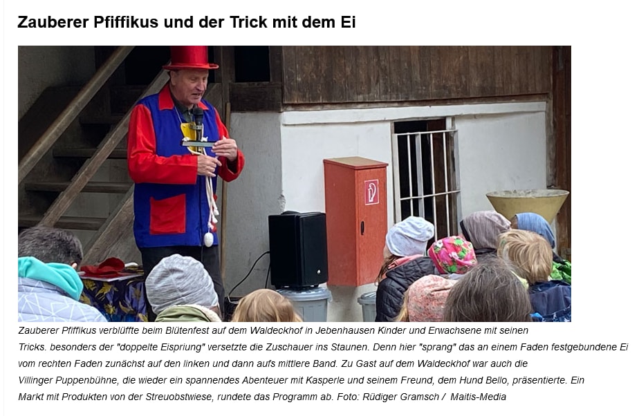 neben der Zauberei bietet Pfiffikus auch noch lustiges spannendes Kaspertheater mit dem lustigen Hund Bello an von 25 Mi. bis 45 Min .9 verschiedene Stücke zur Auswahl auch hier werden die Kinder voll mit einbezogen.lustig und spannend, Daneben auch noch als Ballon Modelierer tätig viele lustige Figuren entstehen dabei alle 3 Programme können miteinander verbunden werden, gerade bei Kindergeburtstagen macht das richtig Spaß, auch wenn dann noch lustige Spiele dazukommen und die Fotoaction. geeignet auch für Stadtfeste,Vereinsfeste,Firmenfeiern, Das ganze Programm dort auch mit Bühnenwagen dabei 50 Kinderstühle 10 Bänke 3 Marktschirme a 3x4m eigene Ton und Lichtanlage Gage ist immer Tagesgage